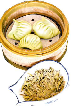橙紅間白的蝦仁餡料,在綠油油、均勻透亮的餃子皮呵護(hù)下,像龍井茶一樣顯得更加?jì)赡郏铱诟兴?、鮮甜,淡淡的龍井清香纏繞在口腔中。