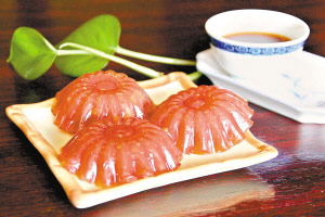 精致的紅茶盞是在原來(lái)傳統(tǒng)的馬蹄糕制作的基礎(chǔ)上,添加上玫瑰紅茶湯水制作而成的。玫瑰紅茶盞顏色如琥珀,入口爽滑不粘牙,濃郁的茶香給人一種飄飄然的感覺(jué),舒心自在。