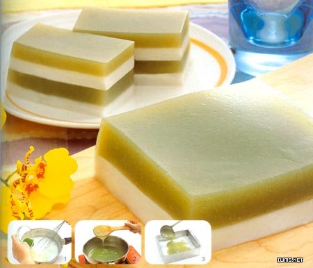 2,將材料(3)中的抹茶粉用少許冷水調(diào)拌開(kāi)來(lái),再與其余材料(3)混合,置于爐子上邊煮邊攪拌,帶沸騰時(shí),快速攪拌至弄抽狀且呈透明色,即可以關(guān)火3,待圖一凝結(jié)了,就倒入圖二,待凝結(jié),即可以食用,食用時(shí)切塊!