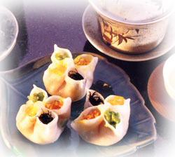 做法:先將胡蘿卜切成小丁,茶葉泡開(kāi)后切成末;將胡蘿卜丁、茶葉末、青豆、玉米粒用適量鹽、雞精、胡椒粉(根據(jù)自己的喜好決定)、蠔油、白糖、麻油調(diào)味后拌勻;加入少量面粉、鹽和油和成面團(tuán)。最后將和好的面搟成薄皮,包入調(diào)好的餡,做成餃子,上屜蒸5分鐘左右即成。