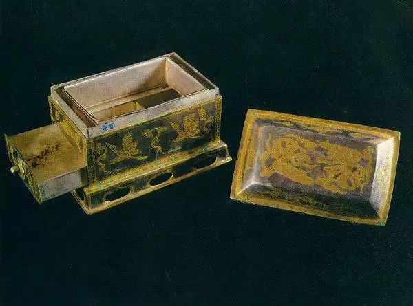 通高9.5厘米,羅身長(zhǎng)13.4厘米,寬8.4厘米。屜長(zhǎng)12.7厘米,寬7.5厘米,高2.0厘米。座長(zhǎng)14.9厘米,寬8.9厘米,高2.0厘米,全重1472克。通體呈長(zhǎng)方形,由蓋、羅、屜、羅架、器座組成,均系鈑金成型,紋飾涂金。蓋頂鏨兩體首尾相對(duì)的飛天,并襯以流云。蓋剎四周各飾一和合云。羅架兩側(cè)飾執(zhí)幡駕鶴仙人,另兩側(cè)為相對(duì)飛翔的仙鶴,四周飾蓮瓣紋。羅和屜均為匣狀,中夾羅網(wǎng),屜面飾流云紋,有拉手。羅架下有臺(tái)形座器,設(shè)鏤空壺門。