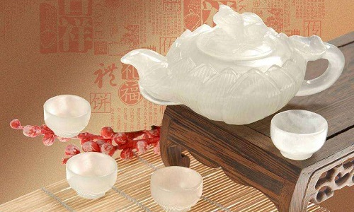 玉質茶具的原料包括真玉(軟玉和硬玉)、綠松石、瑪瑙、水晶、孔雀石、琥珀、紅綠寶石等彩石玉,多制成壺、罐、杯、盞、盅、蓋碗等。