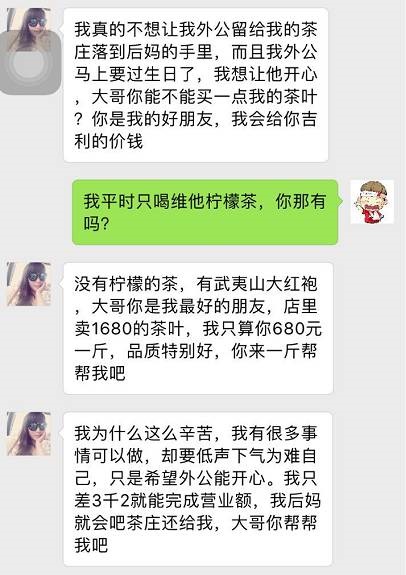 這個(gè)時(shí)候,騙子十有八九會出現(xiàn)跟你說失戀的情況,哭的傷心欲絕,然后跟你傾訴,讓你憐香惜玉,之后會跑到武夷山爺爺奶奶或者外公外婆家中療傷,幫忙種茶炒茶,學(xué)會炒茶葉后決定自立自強(qiáng),開創(chuàng)自己的事業(yè) —— 炒茶葉,賣茶葉。