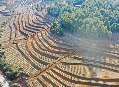 圖為日前,當(dāng)?shù)亟?jīng)過(guò)整治并種上茶樹幼苗的石漠化土地。
