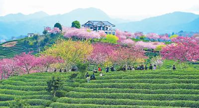 圖為2月17日,游客在福建省龍巖市漳平市永福鎮(zhèn)臺(tái)品櫻花茶園景區(qū)賞花觀景。
