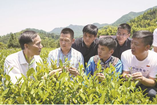 省級(jí)非遺傳承人李賢葆(左一)向朱遠(yuǎn)志(左四)講授舒城小蘭花茶葉的種植、管理技術(shù)。張永攝