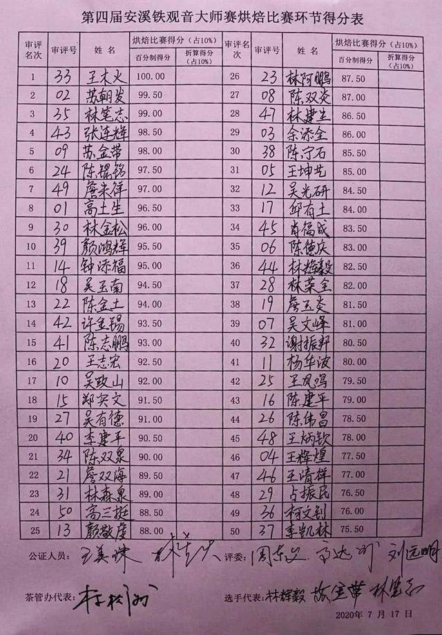 據(jù)主辦方介紹,今年舉辦的第四屆安溪鐵觀音大師賽延續(xù)了前三屆大師賽的賽制規(guī)則。根據(jù)規(guī)則,烘焙比賽要求選手必須在規(guī)定的8個小時內(nèi)用烘焙組委會統(tǒng)一提供的毛凈茶和烘焙機(jī)械,獨立完成烘焙。7月17日下午,本次烘焙比賽茶葉評審組四位評委對50位選手的烘焙茶樣進(jìn)行質(zhì)量審評,按質(zhì)量高低排定名次。經(jīng)過四小時的認(rèn)真審評,第四屆安溪鐵觀音大師賽烘焙比賽環(huán)節(jié)得分表出爐。