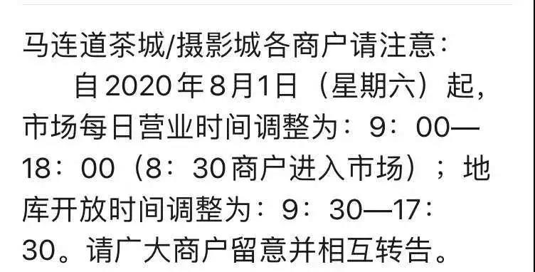 7月22日起,馬連道二商集團旗下的國際茶城、京華緣茶城、天福緣市場已恢復(fù)正常營業(yè),每天營業(yè)時間為9:00-19:00,進入茶城須出示健康寶,不必進行體溫檢測。