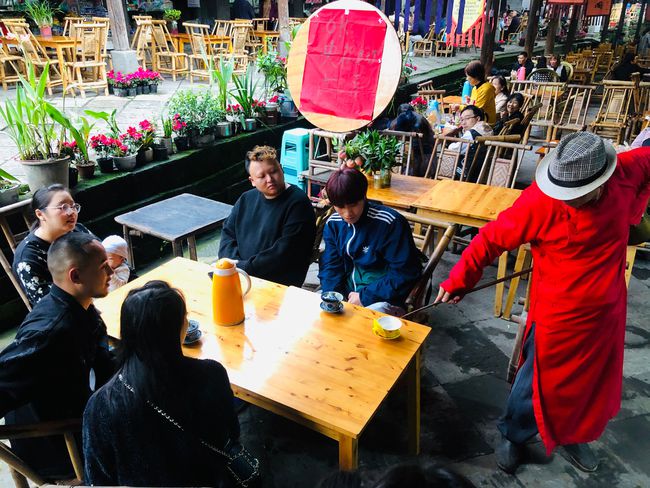頭戴格紋小氈帽,身穿大紅中式長(zhǎng)衫,手拿兩尺長(zhǎng)的煙桿、大煙袋……靠著這身行頭和打扮,老周只要往茶館門(mén)口一站,或者斜躺在搖椅上,悠然自得地“吞云吐霧”,就能輕而易舉地吸引一大撥過(guò)往游客,好奇地拿出手機(jī)、相機(jī),對(duì)著他一陣猛拍。見(jiàn)慣了“長(zhǎng)槍短炮”的老周不煩也不惱,總是配合游客,氣定神閑地?cái)[出各種造型,興致來(lái)了的時(shí)候還會(huì)提出長(zhǎng)嘴銅壺,表演一下茶藝,讓大家拍個(gè)盡興。